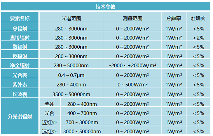 太陽(yáng)輻射是氣象觀測(cè)指標(biāo)中重要內(nèi)容,根據(jù)氣象組織WMO標(biāo)準(zhǔn)要求,太陽(yáng)輻射標(biāo)準(zhǔn)觀測(cè)分為:總輻射、散射輻射、直接輻射、反射輻射、凈全輻射,太陽(yáng)光譜輻射(紫外光、可見(jiàn)光,近紅外光,遠(yuǎn)紅外光)