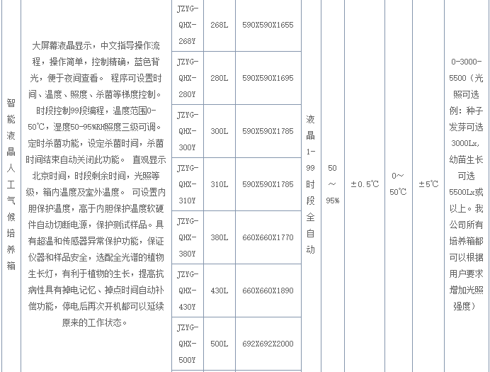智能人工氣候培養(yǎng)箱(種子發(fā)芽箱,智能人工氣候培養(yǎng)箱)每種型號(hào)后面的B代表晝夜兩個(gè)溫度、時(shí)間段;D代表1-30個(gè)溫度、時(shí)間、光照段,自由組合實(shí)驗(yàn)周期顯示,光照級(jí)別顯示。例:JZYG-QHX-268B為晝夜2個(gè)時(shí)間段;JZYG-QHX-268D為1-8個(gè)多時(shí)間段多段設(shè)置其中:溫度、濕度、光照、時(shí)間均可多段設(shè)置。