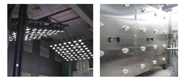 太陽輻射模擬利用連續(xù)光譜的太陽模擬燈矩陣模擬,可調(diào)節(jié)角度及輻射強度,配置可調(diào)穩(wěn)壓電源:紅外熱輻射范圍約為 0~1000W/m2。具體調(diào)節(jié)角度及輻射強度可依據(jù)用戶要求單獨設計。布置形式也依據(jù)需求可頂置也可側置。
