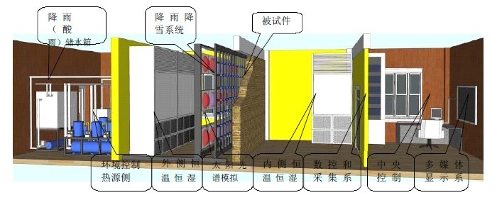 建筑動態(tài)環(huán)境實驗技術是國際建筑技術科學領域的前沿實驗技術,是研究建筑材料、構件和系統(tǒng)性能退化及耐久性的關鍵實驗方法,同時還可以開展建筑節(jié)能、建筑人居環(huán)境等方向的實驗研究。大型建筑全環(huán)境艙動態(tài)實驗平臺是開展建筑動態(tài)環(huán)境實驗的大型實驗系統(tǒng),代表了該領域先進的實驗技術。本實驗系統(tǒng)核心技術為多環(huán)境參數(shù)同步耦合的動態(tài)模擬,不同于傳統(tǒng)的單一環(huán)境參數(shù)穩(wěn)態(tài)環(huán)境模擬。本系統(tǒng)可模擬動態(tài)的溫濕度變化、紅外太陽輻照、紫外太陽輻射、降雨(酸雨)、降雪、陣風等自然環(huán)境條件。