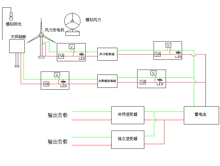 開啟模擬風(fēng)機(jī),使風(fēng)力發(fā)電機(jī)處于發(fā)電工作狀態(tài),與太陽能發(fā)電同時(shí)為蓄電池充電,風(fēng)光充電切換、風(fēng)機(jī)保護(hù)。
