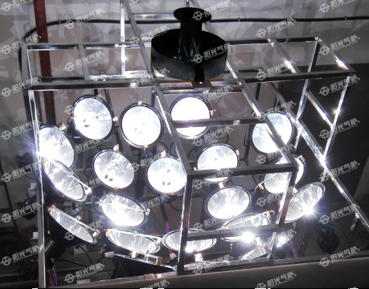 1.1 TRM-PD1H型聚光式太陽模擬發(fā)射器(矩陣式)是錦州陽光科技發(fā)展有限公司根據(jù)多年太陽模擬器生產(chǎn)經(jīng)驗開發(fā)的矩陣式模擬光源(稱人造太陽),專用于太陽能產(chǎn)品室內(nèi)測試的實驗設備。TRM-PD1H型聚光式太陽模擬發(fā)射器(矩陣式)具有操作簡單、使用方便,安全可靠的特點。模擬器光源采用(20)組獨立的聚光點光源,組成矩陣式結(jié)構(gòu),光源的個數(shù)、位置、光強都靈活可調(diào),以保證有效輻照面積內(nèi)的光均勻性和穩(wěn)定性。采用主機現(xiàn)場與微機網(wǎng)絡聯(lián)合定時控制功能,可以手動或自動啟動光源,定時控制發(fā)光時間,為保證光源質(zhì)量,用太陽輻射儀實時監(jiān)測光源的輻射及亮度,由于氙燈照射溫度較高,設有測溫報警及電氣漏電保護裝置以保證系統(tǒng)的安全。該產(chǎn)品適用于檢測中心,科研機構(gòu),太陽能產(chǎn)品生產(chǎn)廠家等單位。