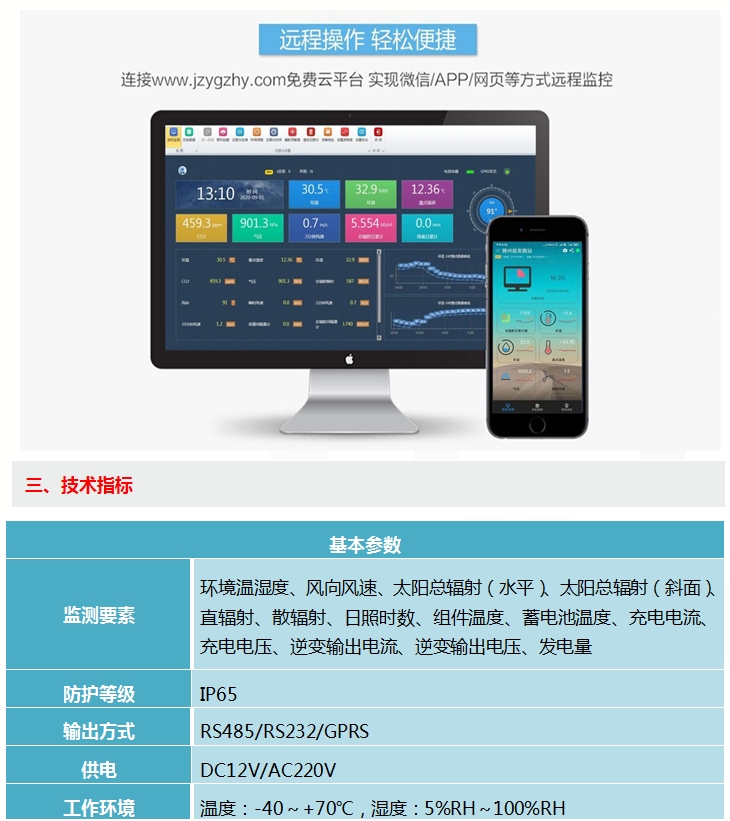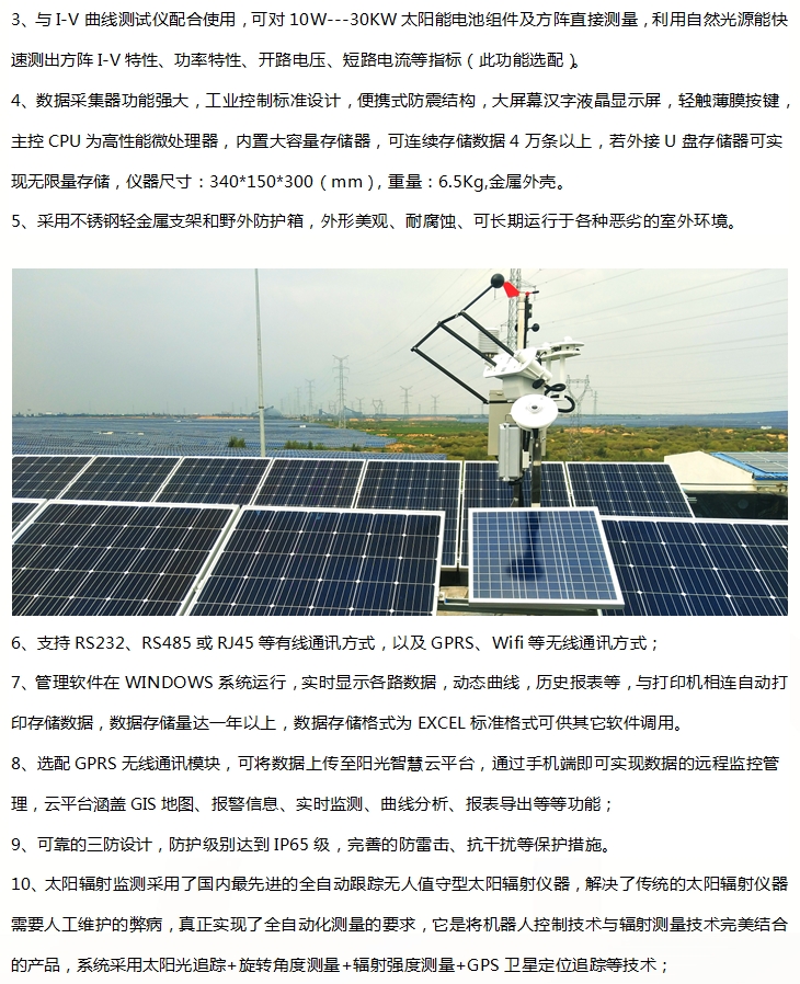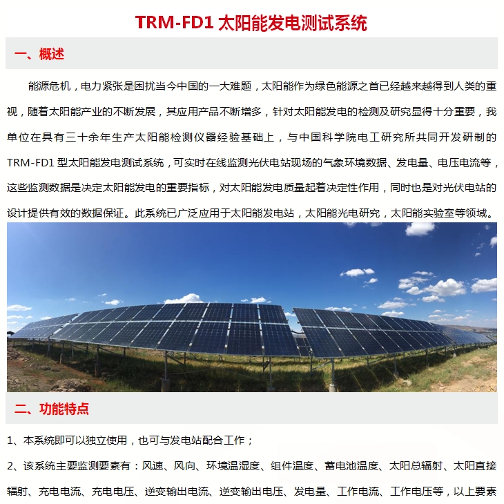 TRM-FD1型太陽能發(fā)電測(cè)試系統(tǒng),可實(shí)時(shí)在線監(jiān)測(cè)光伏電站現(xiàn)場(chǎng)的氣象環(huán)境數(shù)據(jù)、發(fā)電量、電壓電流等,這些監(jiān)測(cè)數(shù)據(jù)是決定太陽能發(fā)電的重要指標(biāo),對(duì)太陽能發(fā)電質(zhì)量起著決定性作用,同時(shí)也是對(duì)光伏電站的設(shè)計(jì)提供有效的數(shù)據(jù)保證。