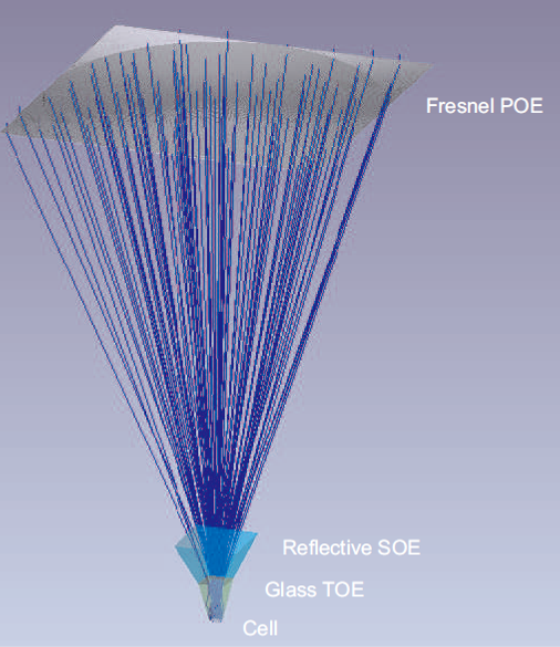 聚光光路設(shè)計中,入射光通過三級聚光部件進行聚光。其中初級光學(xué)器件(菲涅爾非成像玻璃透鏡)裝配到組件框架結(jié)構(gòu)上,二三級光學(xué)器件裝配到聚光接收器模塊上。這種設(shè)計將入射接收角提高至±0.86°,同時提高光線均勻度。有效的提高了功率和效率。該光學(xué)器件及光路解決方案由德國知名光學(xué)設(shè)計公司提供。