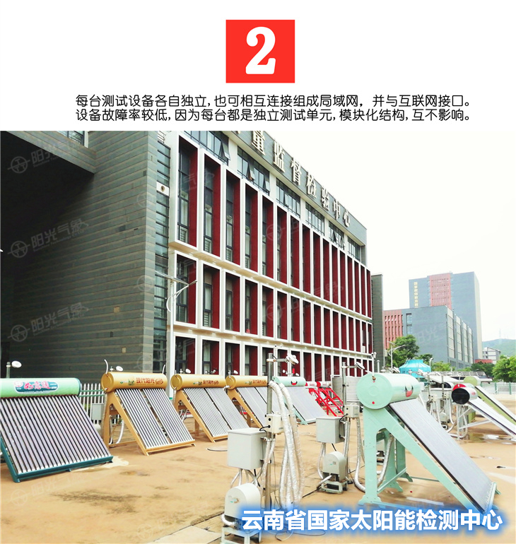 多年來(lái)錦州陽(yáng)光氣象科技公司建設(shè)了眾多太陽(yáng)能檢測(cè)中心,均都通過(guò)了CNAS認(rèn)證,得到了認(rèn)可. 我們根據(jù)多年研究太陽(yáng)能熱水器檢測(cè)設(shè)備的經(jīng)驗(yàn),結(jié)合了檢測(cè)技術(shù),現(xiàn)推出先進(jìn)的網(wǎng)絡(luò)化太陽(yáng)能測(cè)試系統(tǒng), 可滿(mǎn)足廣大太陽(yáng)能熱水器生產(chǎn)廠(chǎng),質(zhì)檢所,檢測(cè)中心,科研教學(xué)等領(lǐng)域的使用。