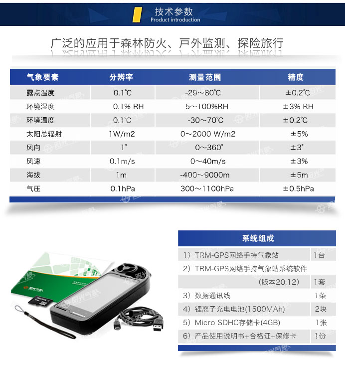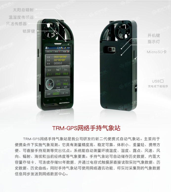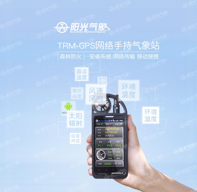 手持氣象站是我公司研發(fā)的新二代便攜式自動氣象站。主要用于便攜條件下實(shí)施氣象觀測。它具有測量精度高、穩(wěn)定可靠、體積小、重量輕、攜帶方便、可直接手持觀測等突出優(yōu)點(diǎn)。系統(tǒng)能自動測量環(huán)境溫度、濕度、露點(diǎn)、風(fēng)速、風(fēng)向、輻射、海拔和當(dāng)前經(jīng)緯度等氣象要素。手持氣象站可自動儲存歷史數(shù)據(jù),內(nèi)置大容量存儲卡,可連續(xù)存儲50年數(shù)據(jù),并通過電容式觸摸屏直接讀取實(shí)時氣象數(shù)據(jù)、歷史數(shù)據(jù)、歷史曲線。同時手持氣象站可使用網(wǎng)絡(luò)通訊功能,將實(shí)時采集到的氣象數(shù)據(jù)信息同步發(fā)送到網(wǎng)絡(luò)數(shù)據(jù)中心。