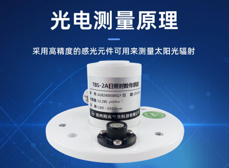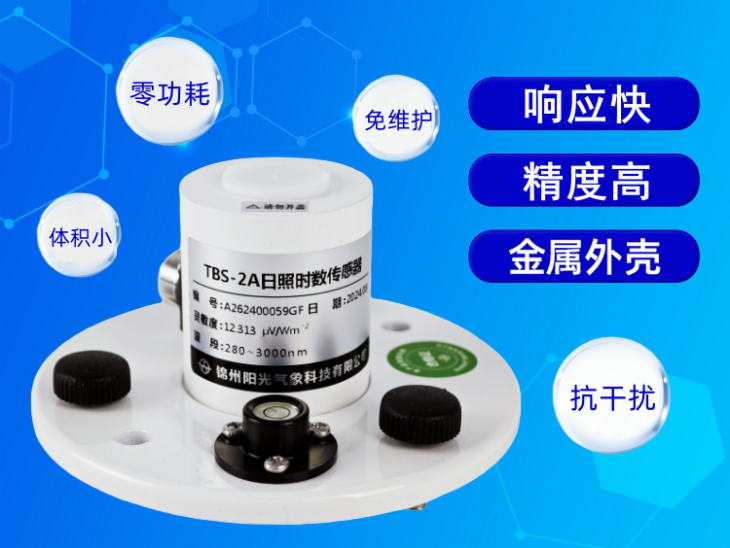 日照時數(shù)是指太陽每天在垂直于太陽光線平面上的輻射強度超過或等于120W/m2時間段的總和,以小時為單位,取一位小數(shù)。日照時數(shù)也稱實照時數(shù)。TBS-2A日照時數(shù)傳感器用于連續(xù)測量太陽輻射量,通過計算統(tǒng)計得到日照時間,儀器本身沒有移動部件、不需供電、免于維護,能夠勝任野外的長期監(jiān)測使用。