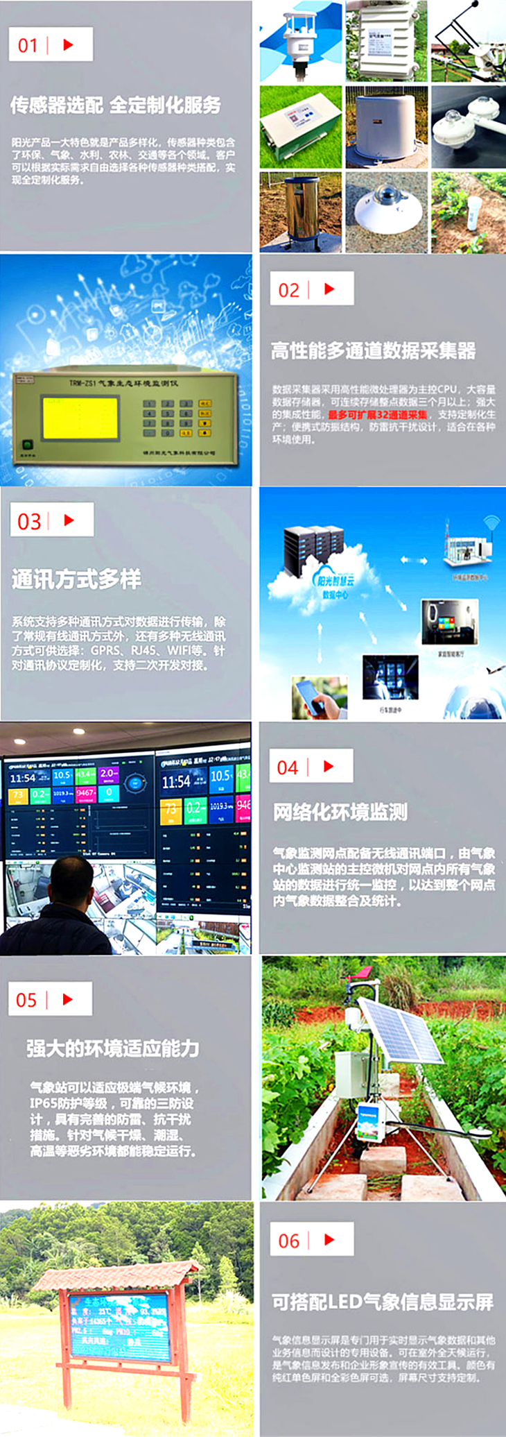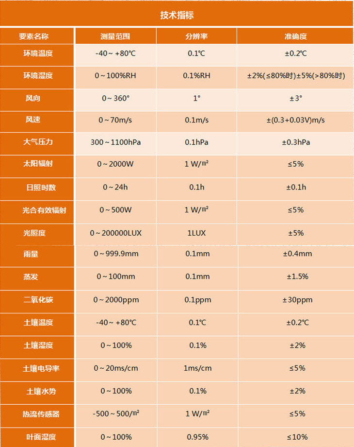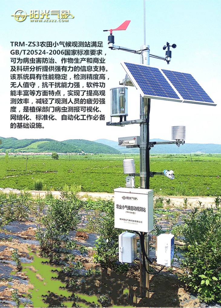 TRM-ZS3農(nóng)田小氣候觀測(cè)站滿足GB/T 20524-2006國家標(biāo)準(zhǔn)要求,可為病蟲害防治、作物生產(chǎn)和商業(yè)及科研分析提供強(qiáng)有力的信息支持。該系統(tǒng)具有性能穩(wěn)定,檢測(cè)精度高,無人職守,抗干擾能力強(qiáng),軟件功能豐富等方面特點(diǎn)。