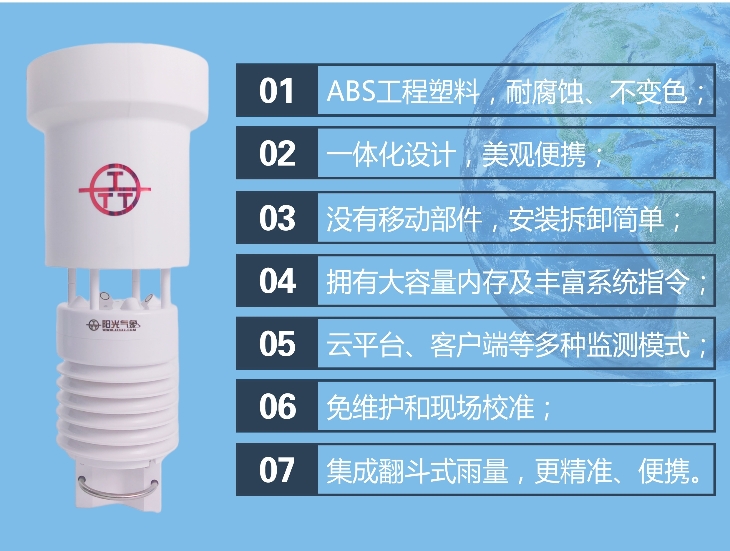 PC-8K型氣象六參數(shù)環(huán)境監(jiān)測(cè)儀是我公司自主研制的一款測(cè)量多種氣象要素的專業(yè)級(jí)一體化氣象站,可同時(shí)測(cè)量大氣溫度、大氣濕度、風(fēng)速、風(fēng)向、氣壓、雨量等主要?dú)庀笠?。其中雨量為高精度翻斗式雨量傳感器,其特點(diǎn)是精度高,響應(yīng)速度快,串口輸出,方便用戶直接通過PC或外接儀器進(jìn)行采集。