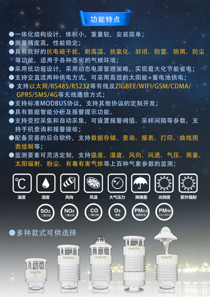智慧路燈桿作為一個很好的載體,智慧燈桿配備的氣象檢測可以24小時實時在線連續(xù)采集監(jiān)測環(huán)境及氣象數(shù)據(jù),包括PM2.5,溫度、濕度、氣壓、風向、風速、風力、噪音等等,并可在信息屏上實時顯示。系統(tǒng)提供的統(tǒng)計分析功能,還可分析出一段時間,如一個月、半年等維度的空氣質量整體情況,輸出統(tǒng)計報告等。