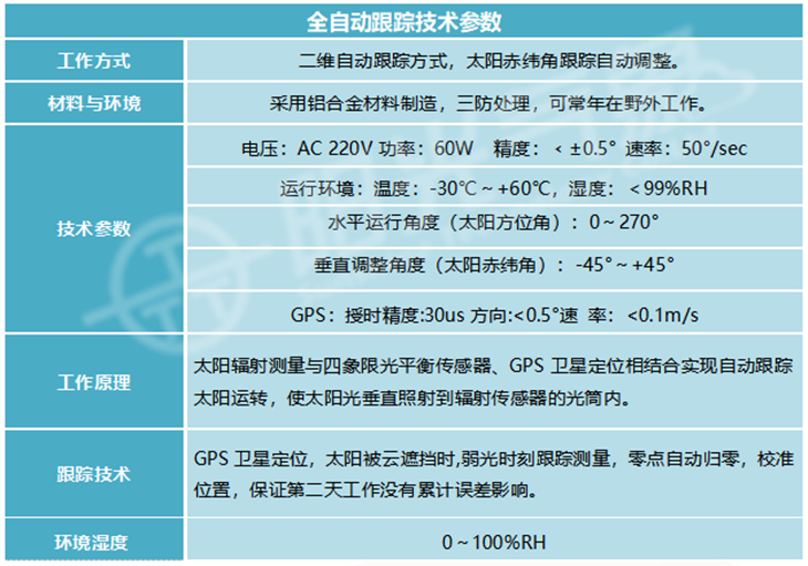 3、自主研發(fā)的太陽輻射儀是目前國內(nèi)最先進的無人值守型太陽輻射儀器,解決了傳統(tǒng)的光伏電站太陽輻射儀器需要人工維護的弊病,真正實現(xiàn)了全自動化測量的要求,它是將機器人控制技術(shù)與輻射測量技術(shù)完美結(jié)合的產(chǎn)品,系統(tǒng)采用太陽光追蹤+旋轉(zhuǎn)角度測量+輻射強度測量+GPS衛(wèi)星定位追蹤等