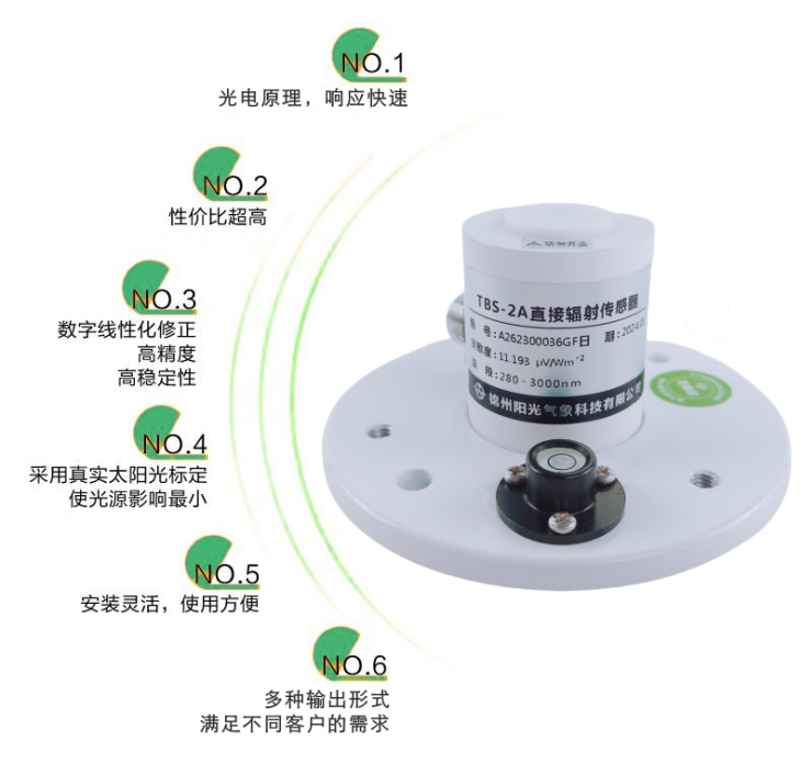 TBS-2A直輻射傳感器專門用于監(jiān)測和記錄太陽直接輻射的強度。其核心部件是高精度感光元件,這些元件對光線具有極高的敏感性,能夠捕捉太陽輻射中未經(jīng)大氣散射、反射或吸收的那部分能量,精確地將光信號轉(zhuǎn)換為電信號,通過測量這一電信號的大小,可以準確反映太陽光的直接輻射強度。儀器本身沒有移動部件、不需供電、免于維護,能夠勝任野外的長期監(jiān)測使用。