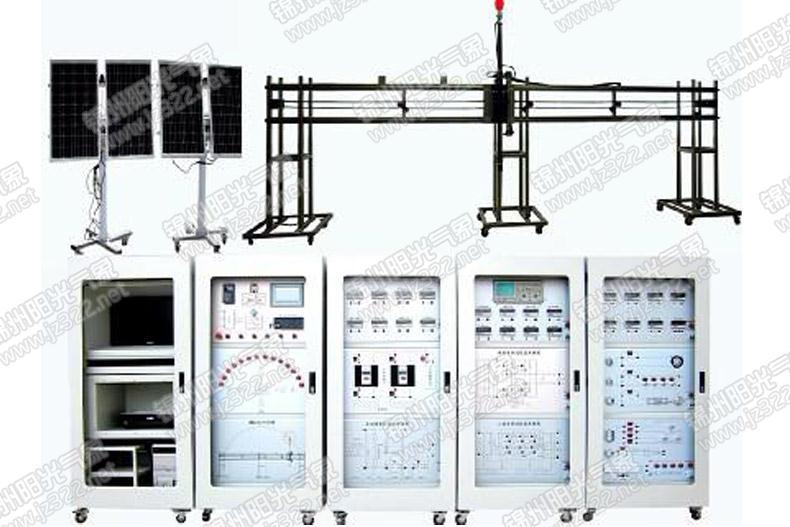 YG-JXST05型大型模擬太陽(yáng)升降、太陽(yáng)跟蹤、光伏發(fā)電、充電逆變實(shí)訓(xùn)裝置采用1000W節(jié)能燈模擬太陽(yáng),實(shí)驗(yàn)裝置可以模擬太陽(yáng)的弧線升降全過(guò)程,而且模擬太陽(yáng)的升降時(shí)間可以根據(jù)實(shí)驗(yàn)需要進(jìn)行更改。兩臺(tái)太陽(yáng)跟蹤系統(tǒng)對(duì)模擬太陽(yáng)的移動(dòng)進(jìn)行跟蹤,兩臺(tái)太陽(yáng)跟蹤系統(tǒng)上的光伏發(fā)電裝置分別在模擬太陽(yáng)下的進(jìn)行發(fā)電,并在充電控制系統(tǒng)的控制下向蓄電池充電,逆變系統(tǒng)對(duì)蓄電池的直流電進(jìn)行逆變,產(chǎn)生220V交流電,并給燈泡交流電機(jī)等負(fù)載供電。