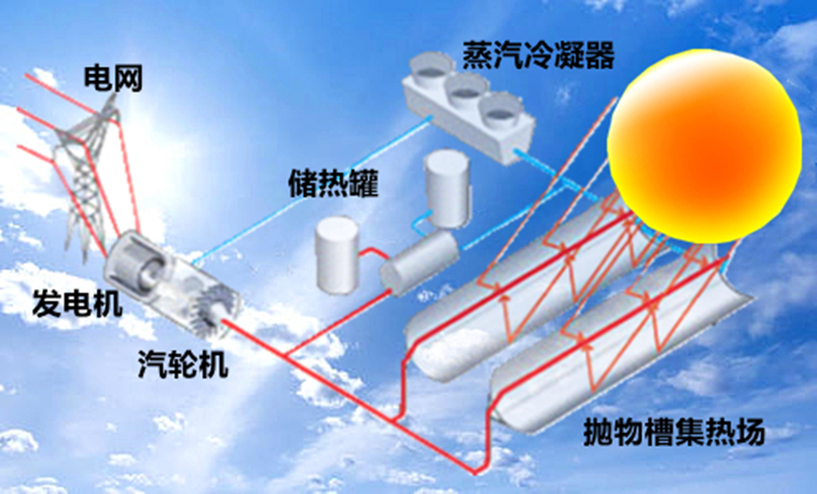 槽式太陽能熱發(fā)電是利用槽式聚光鏡將太陽光聚在一條線上,在這條線上安裝著一個管狀集熱器,用來吸收太陽能,并對傳熱工質(zhì)進行加熱,再借助溫差發(fā)電機發(fā)電。槽式聚光器的拋物面對太陽進行的是一維跟蹤,聚光比為10~100,溫度可以達到400℃。