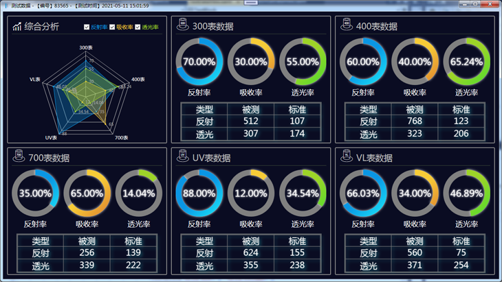 4.檢測數(shù)據(jù)自動(dòng)存儲(chǔ),實(shí)時(shí)顯示測試結(jié)果,自動(dòng)計(jì)算并繪制反射率,吸收率,透光率曲線圖。