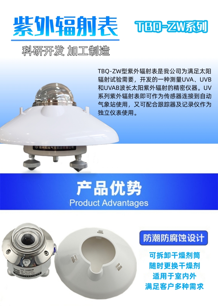 TBQ-ZW型紫外輻射表是我公司為滿(mǎn)足太陽(yáng)輻射試驗(yàn)的需要,開(kāi)發(fā)的一種測(cè)量UVA、UVB和UVAB波長(zhǎng)太陽(yáng)紫外輻射的精密儀器。UV系列紫外輻射表即可作為傳感器連接到自動(dòng)氣象站使用,又可配合跟蹤器及記錄儀作為獨(dú)立儀表使用。
