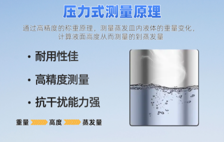 蒸發(fā)傳感器的工作原理基于高精度的稱重技術(shù),通過測量蒸發(fā)皿內(nèi)液體的重量,進(jìn)而計算出液面高度,因此,該傳感器適用于多種環(huán)境條件。這一設(shè)計有效解決了使用超聲波原理測量液面高度時存在的結(jié)冰狀態(tài)下測量不準(zhǔn)確、無水時易損壞傳感器以及精度低等弊端,能夠與自動氣象站或?qū)I(yè)蒸發(fā)記錄儀無縫配合使用。