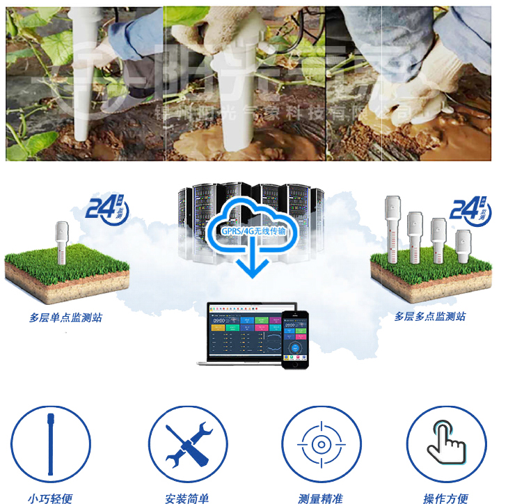 采用FDR原理,根據(jù)監(jiān)測儀發(fā)出的電磁波在不同介電系數(shù)物質(zhì)中的頻率變化測得各土層的濕度,利用高精度數(shù)字溫度傳感器,測量各土層溫度。默認同時測量10cm,20cm,30cm,40m,50cm五個土層的溫度和濕度,適用于具有代表性土壤的長期不間斷監(jiān)測;內(nèi)置RTU及電池,可提供RS485輸出,還可以通過GPRS無線網(wǎng)絡(luò)傳輸數(shù)據(jù)至物聯(lián)網(wǎng)數(shù)據(jù)平臺,實時用電腦或手機查看數(shù)據(jù),方便快捷,極大的滿足了各方面使用的需求。