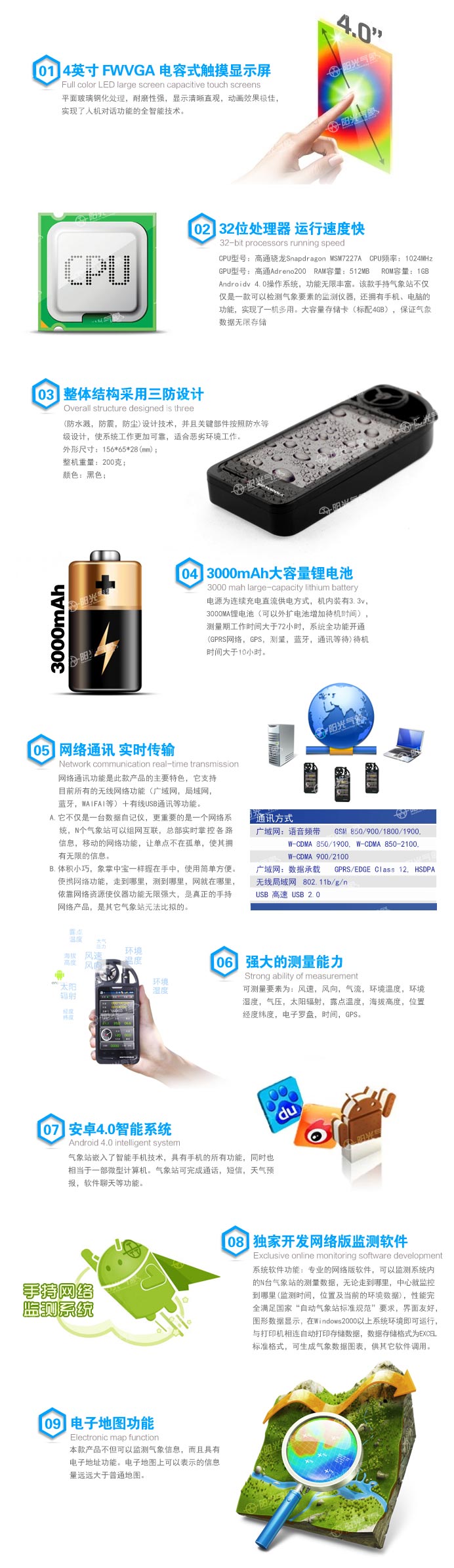 手持氣象站是我公司研發(fā)的新二代便攜式自動氣象站。主要用于便攜條件下實(shí)施氣象觀測。它具有測量精度高、穩(wěn)定可靠、體積小、重量輕、攜帶方便、可直接手持觀測等突出優(yōu)點(diǎn)。系統(tǒng)能自動測量環(huán)境溫度、濕度、露點(diǎn)、風(fēng)速、風(fēng)向、輻射、海拔和當(dāng)前經(jīng)緯度等氣象要素。手持氣象站可自動儲存歷史數(shù)據(jù),內(nèi)置大容量存儲卡,可連續(xù)存儲50年數(shù)據(jù),并通過電容式觸摸屏直接讀取實(shí)時氣象數(shù)據(jù)、歷史數(shù)據(jù)、歷史曲線。同時手持氣象站可使用網(wǎng)絡(luò)通訊功能,將實(shí)時采集到的氣象數(shù)據(jù)信息同步發(fā)送到網(wǎng)絡(luò)數(shù)據(jù)中心。