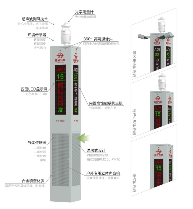 PC-9XQH 景區(qū)氣象站是錦州陽光氣象旗下的一款集氣象環(huán)境監(jiān)測、語音播報、LED彩屏顯示、智能安防、美化園林等功能于一體的智能平臺型氣象監(jiān)測產(chǎn)品。實現(xiàn)了物聯(lián)網(wǎng)云端監(jiān)測,是基于大數(shù)據(jù)軟件技術和智能傳感器硬件技術研發(fā)出的新一代高科技產(chǎn)品。