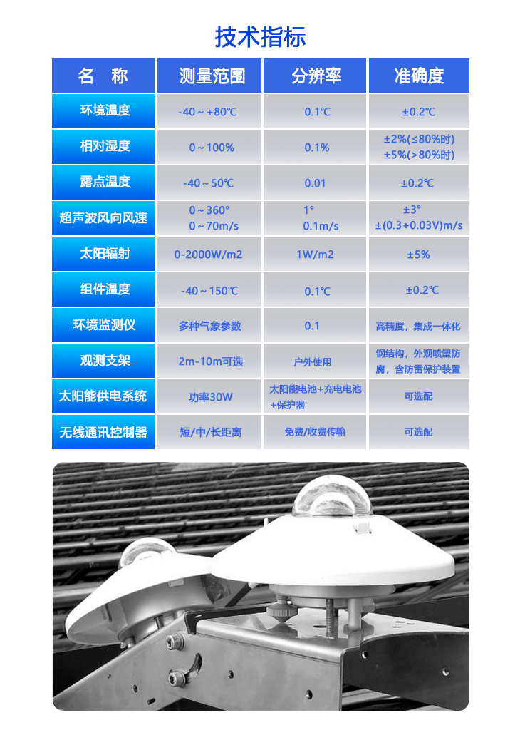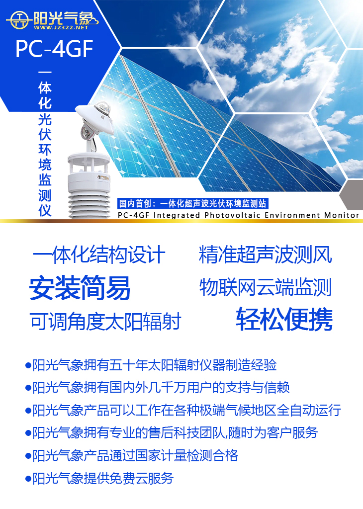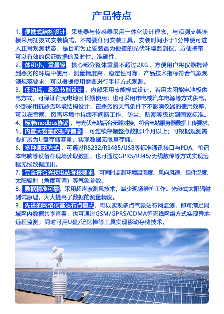 本產(chǎn)品是專業(yè)針對光伏發(fā)電站研發(fā)生產(chǎn)的一體化光伏環(huán)境監(jiān)測儀,該設(shè)備采用新型一體化結(jié)構(gòu)設(shè)計,測量精度高,安裝使用方便,采用獨特的一體化超聲波微氣象儀,集溫濕度、風(fēng)速、風(fēng)向、壓力、背板溫度集成于一體。具有高精度,高穩(wěn)定性,是目前非常適合光伏發(fā)電站上使用的一體化光伏環(huán)境監(jiān)測儀。
